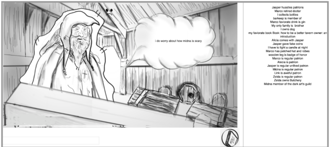 In Scheherazade's Tavern, we present a game prototype that focuses on player-NPC interaction. Our system combines social simulation (through the Ensemble Engine) with a chatbot-like interface accompanied by character knowledge modeling.